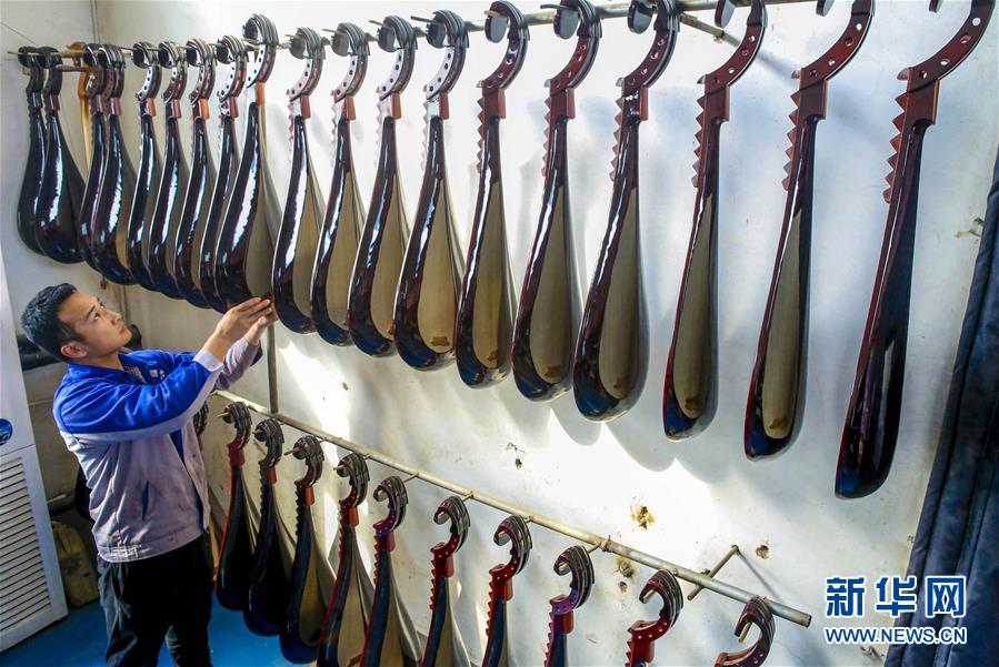 10月20日,在河北省饒陽(yáng)縣一家民族樂器廠,工人擺放琵琶半成品。