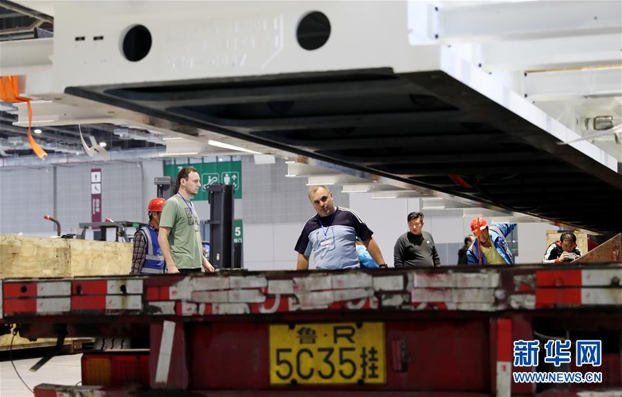 10月22日,德國工程師馬丁·霍爾茨海德(中)在吊裝過程中查看“金牛座”龍門銑床床身位置。 當(dāng)日,來自德國的首屆進(jìn)口博覽會最大展品——“金牛座”龍門銑床完成初步組裝,將運(yùn)往國家會展中心(上海)3號館進(jìn)行最后的安裝施工。這是德國瓦德里希科堡公司研發(fā)的機(jī)床設(shè)備,高約8米,占地面積約200平方米,將在智能及高端裝備區(qū)進(jìn)行展出。 新華社記者方喆攝