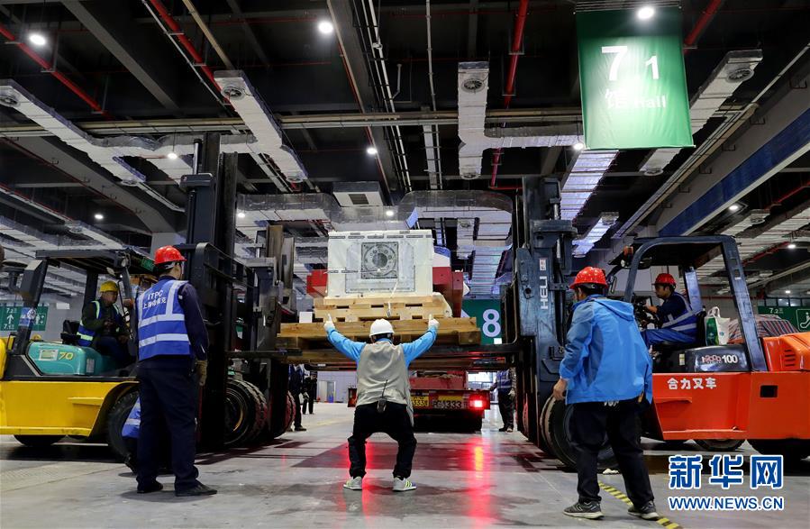 10月22日,現(xiàn)場工人動(dòng)用四臺(tái)叉車同時(shí)作業(yè),將“金牛座”龍門銑床核心部件溜板滑枕抬起后等待卡車就位裝車。 當(dāng)日,來自德國的首屆進(jìn)口博覽會(huì)最大展品——“金牛座”龍門銑床完成初步組裝,將運(yùn)往國家會(huì)展中心(上海)3號(hào)館進(jìn)行最后的安裝施工。這是德國瓦德里??票す狙邪l(fā)的機(jī)床設(shè)備,高約8米,占地面積約200平方米,將在智能及高端裝備區(qū)進(jìn)行展出。 新華社記者方喆攝