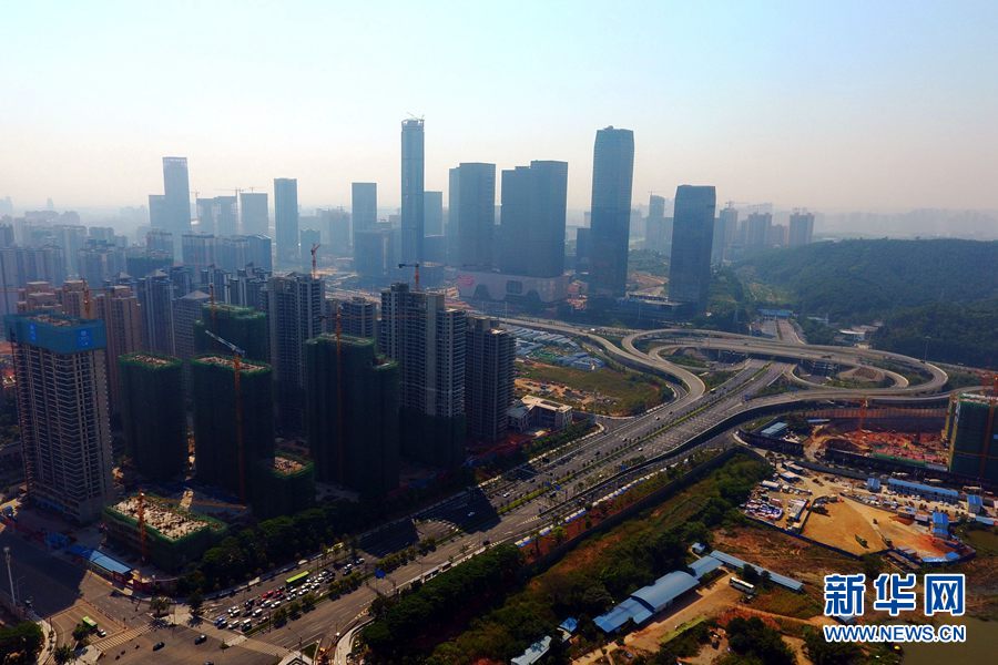 廣西南寧五象新區(qū)地處邕江之南,東起八尺江,西鄰水塘江,北起邕江,南望濱海,規(guī)劃面積約200平方公里。新區(qū)將規(guī)劃建設(shè)成為南寧市構(gòu)建區(qū)域性商貿(mào)物流基地、先進(jìn)制造業(yè)基地、面向東盟的大型企業(yè)總部基地及文化交流展示合作的重要樞紐、信息中心及金融中心的重要支撐的現(xiàn)代新城。圖為無(wú)人機(jī)航拍建設(shè)中的五象新區(qū)(攝于2018年10月7日)。新華網(wǎng)發(fā) 韋秀玲攝
