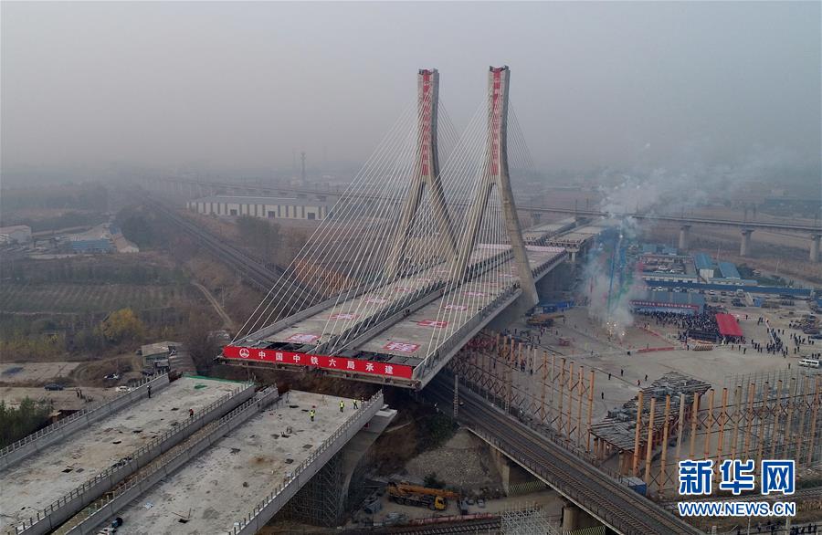 10月25日,唐山市二環(huán)路項目上跨津山鐵路斜拉橋轉體成功(無人機拍攝)。 當日,河北省唐山市二環(huán)路項目上跨津山鐵路斜拉橋轉體成功。據(jù)介紹,該橋總長927.5米,主橋由斜拉轉體橋和轉體T構橋組成,轉體總重5.1萬噸,其中斜拉轉體橋重3.3萬噸,主塔高達80.5米,為曲線變截面“雙人字”形空心塔,自上而下共有128根斜拉索。 新華社記者楊世堯攝