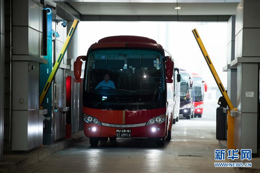 10月24日,跨境巴士在澳門口岸離境車道上通關(guān)。當(dāng)日9時(shí),港珠澳大橋正式通車。 新華社記者張金加攝