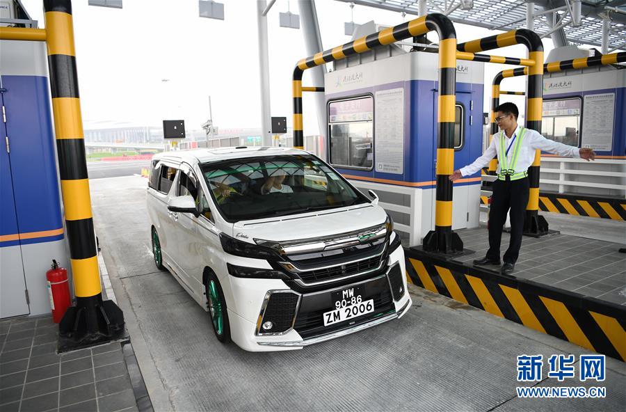10月24日,首輛從珠海開往香港的私家車輛通過(guò)港珠澳大橋收費(fèi)站。當(dāng)日,港珠澳大橋正式通車。 新華社記者梁旭攝