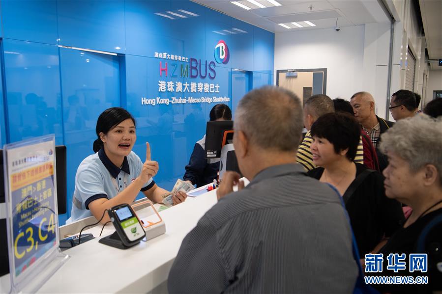 10月24日,市民在澳門離境大堂穿梭巴士售票處購買車票。 當日,港珠澳大橋正式通車。