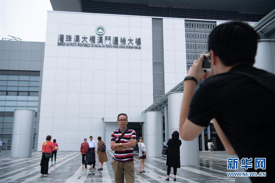10月24日,市民在港珠澳大橋澳門(mén)邊檢大樓外拍照留念。 當(dāng)日,港珠澳大橋正式通車(chē)。