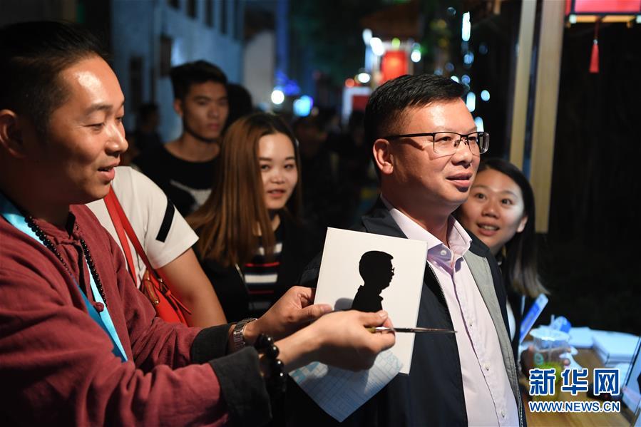 10月29日,在首屆天下碼商大會碼商集市上,一位剪紙藝人(左)在展示為顧客現(xiàn)場創(chuàng)作的肖像剪紙。 10月28日至30日,由福州市政府聯(lián)合支付寶主辦的首屆天下碼商大會在福建福州舉行。 新華社記者 姜克紅 攝