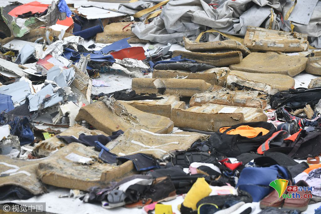 搜救人員打撈上來(lái)飛機(jī)的殘骸。
