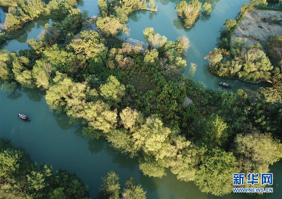10月29日,游船行駛在西溪濕地河道上(無人機拍攝)。 新華社記者翁忻旸攝