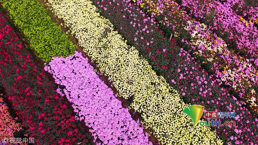 河南許昌觀賞彩菊綻放如五彩地毯 航拍展現(xiàn)震撼美