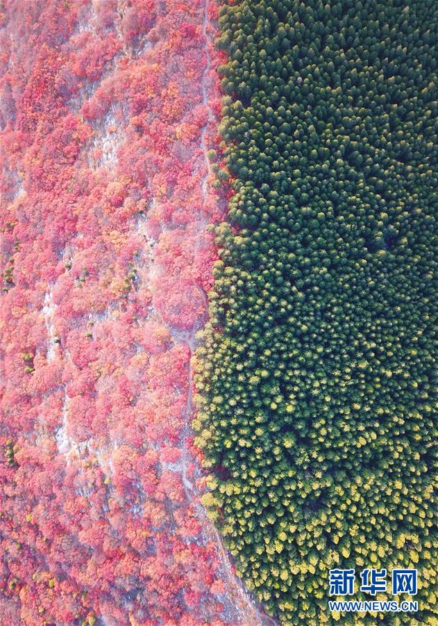 這是山東濟(jì)南楔子山色彩分明的樹林(10月31日無(wú)人機(jī)拍攝)。 新華社記者朱崢攝