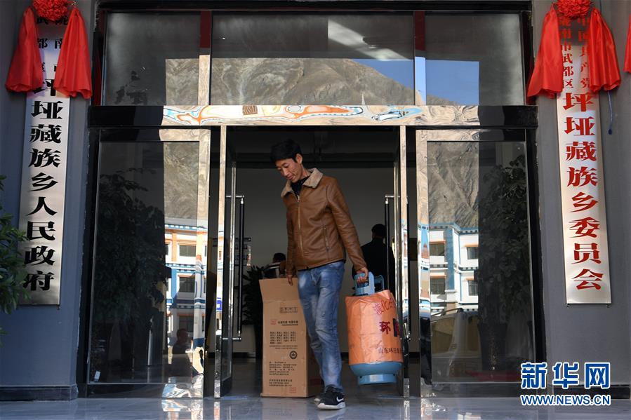 在隴南市武都區(qū)“新坪埡”,村民到鄉(xiāng)政府領(lǐng)取幫扶單位贈送的灶具(10月31日攝)。新華社記者 范培珅攝