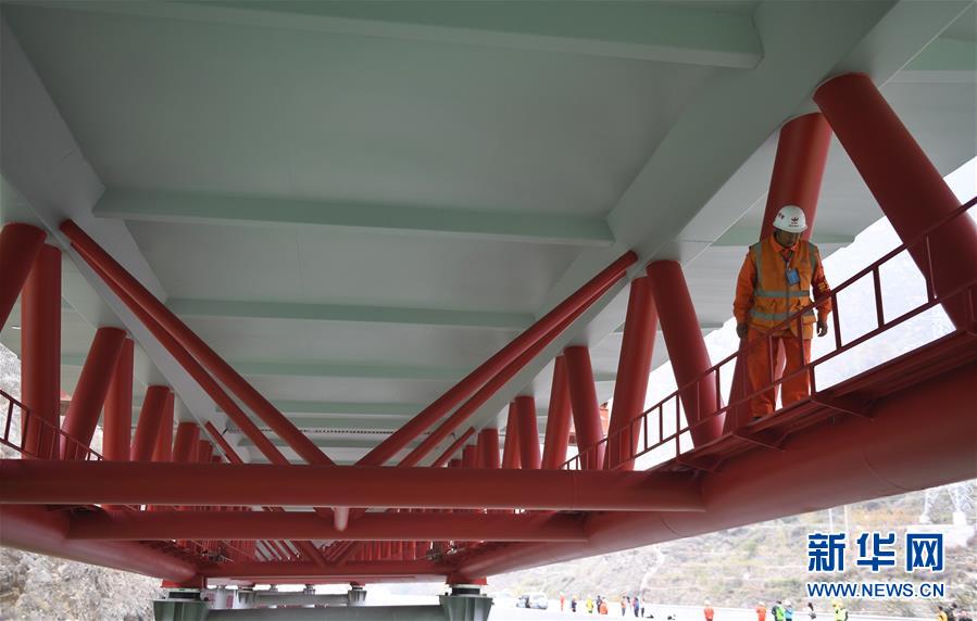 11月3日,安全管理員在克枯大橋上檢查。 當日,位于四川省阿壩藏族羌族自治州的汶(川)馬(爾康)高速的控制性工程克枯大橋合龍。 新華社記者 劉坤 攝