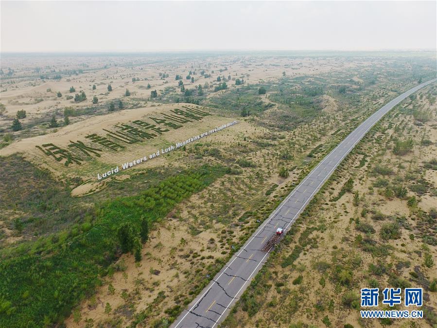 庫布其沙漠中的一條穿沙公路,兩旁綠意盎然(8月1日無人機拍攝)。 新華社記者劉磊攝