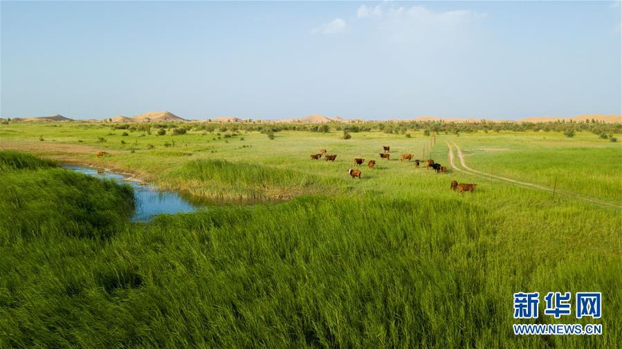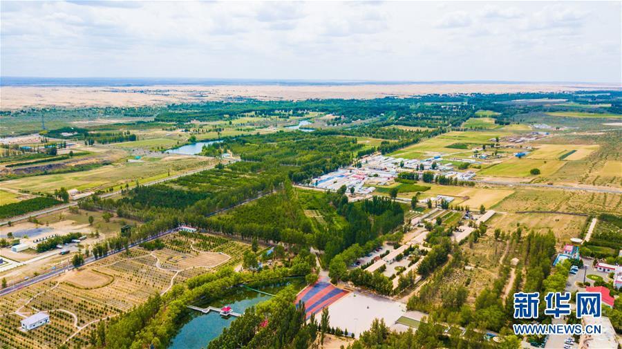 地處庫布其沙漠的恩格貝景區(qū)(6月8日無人機拍攝)。