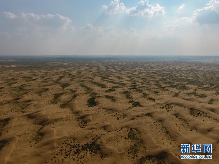 內蒙古杭錦旗沙日召嘎查牧民白音道爾計治理過的庫布其沙漠(7月31日無人機拍攝)。 新華社記者邢廣利攝