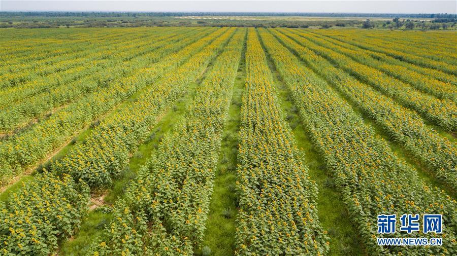 內蒙古達拉特旗白土梁林場的沙棘葵花套種田(8月1日無人機拍攝)。 新華社記者張善臣攝