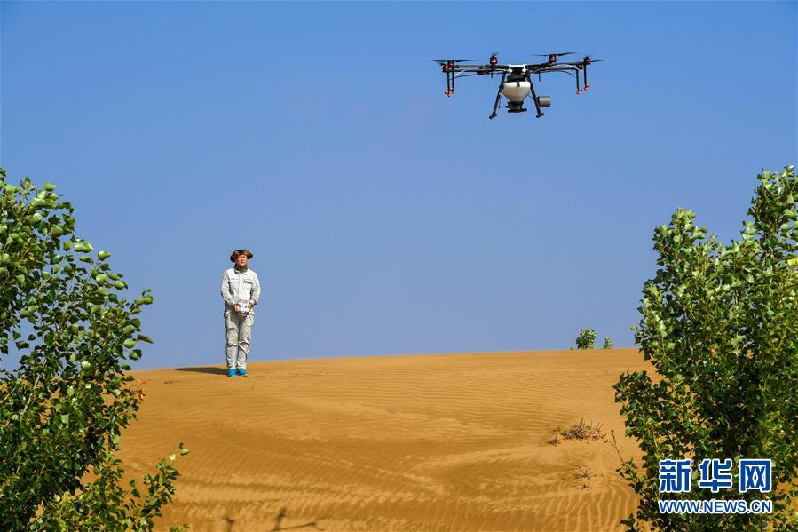 在內蒙古鄂爾多斯市杭錦旗的庫布其沙漠中,技術人員操控無人機飛播造林(7月11日攝)。