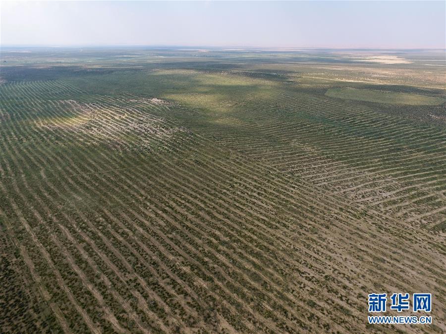 內(nèi)蒙古杭錦旗沙日召嘎查牧民白音道爾計(jì)種植的甘草等沙生植物(7月31日無(wú)人機(jī)拍攝)。 新華社記者劉磊攝