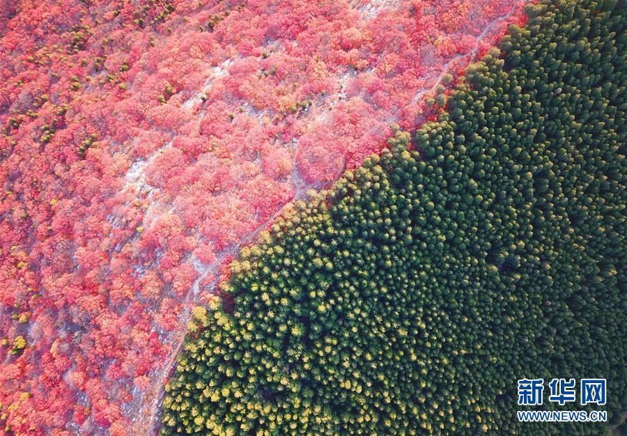 這是山東濟(jì)南楔子山色彩分明的樹林(10月31日無人機(jī)拍攝)。 新華社記者 朱崢 攝