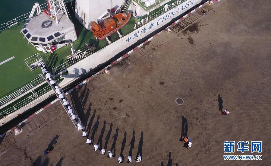 11月3日,海事執(zhí)法人員登上“海巡21”輪(無人機(jī)拍攝)。 當(dāng)日,隨著“海巡21”輪緩緩駛離??诤J卤O(jiān)管基地碼頭,由瓊桂粵海事部門共同開展的瓊州海峽、北部灣及環(huán)海南島水域跨轄區(qū)聯(lián)合巡航執(zhí)法活動(dòng)揭開序幕。 新華社記者楊冠宇攝
