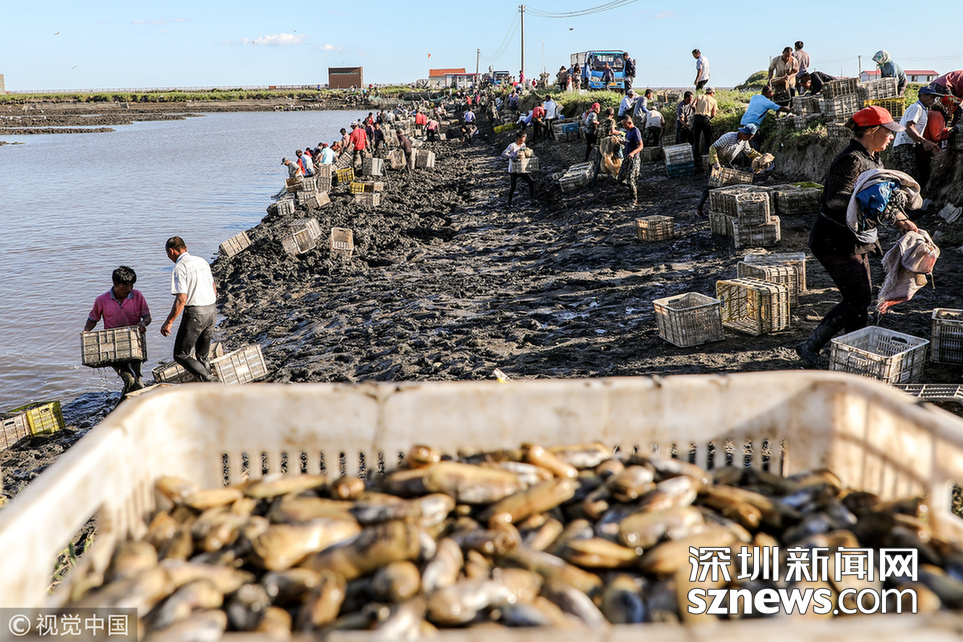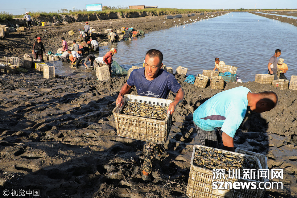 深圳新聞網(wǎng)訊 2018年9月8日,遼寧丹東,早上5點,挖蟶人紛紛下到各個池子,要在海水海泥里艱辛勞作10小時,直至下午3點集體上岸,等待買家的運輸車隊運走他們的勞動成果。9月初,遼寧沿海養(yǎng)殖區(qū)進入養(yǎng)殖海鮮的收獲季。在東港,常常出現(xiàn)數(shù)百人乃至上千人集結(jié)在池子里挖蟶子(這里特指縊蟶,即東港當(dāng)?shù)厝怂f的小人仙。下同)的壯觀景象。在養(yǎng)殖海鮮的收獲季,成群的海鷗趁機“助陣“,人與大自然和諧共處的畫面令人嘆為觀止。