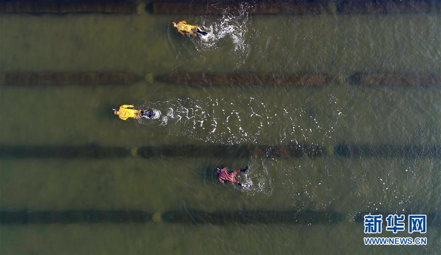 10月22日,樂亭縣姜各莊鎮(zhèn)二節(jié)村海參養(yǎng)殖基地的工人在捕撈海參(無人機拍攝)。 時下,正值渤海灣地區(qū)海參收獲時節(jié),河北省樂亭縣的海參養(yǎng)殖戶忙著捕撈海參,供應(yīng)各地市場。據(jù)介紹,該縣海域水質(zhì)優(yōu)良、氣候適宜,是海參養(yǎng)殖的理想場地,目前發(fā)展池塘造礁養(yǎng)殖海參面積6萬畝,年產(chǎn)鮮活海參6000多噸,年產(chǎn)值2億多元。 新華社記者 楊世堯 攝