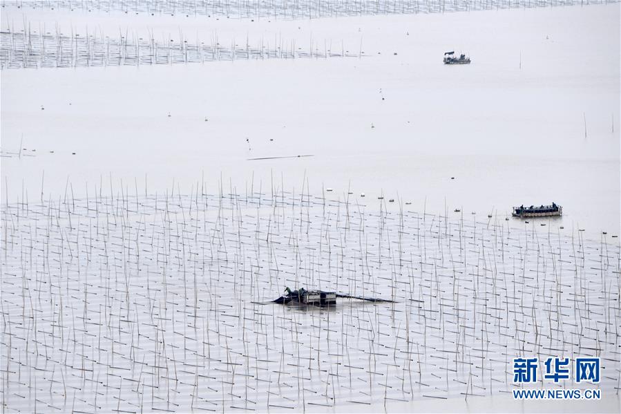 11月4日,漁民在霞浦縣三沙鎮(zhèn)的紫菜種植區(qū)收獲紫菜。 近日,福建省霞浦縣沿海6萬畝紫菜迎來收獲季節(jié),漁民們出海收獲紫菜,海上田園一派繁忙豐收景象。 新華社記者 姜克紅 攝