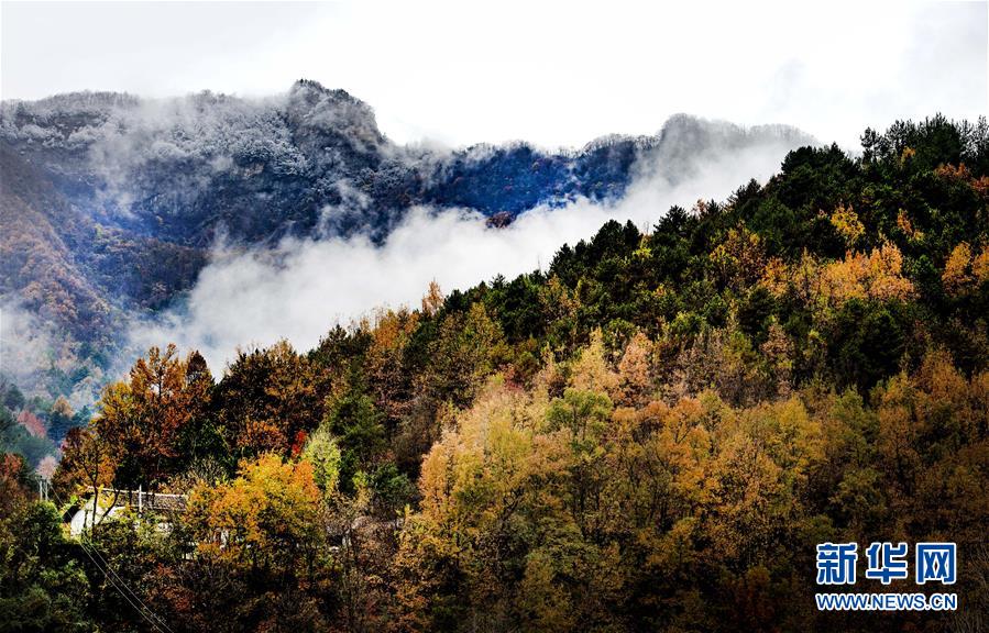 11月5日無人機(jī)拍攝的陜西省漢中市佛坪縣城旁的秦嶺景色。 新華社記者陶明攝