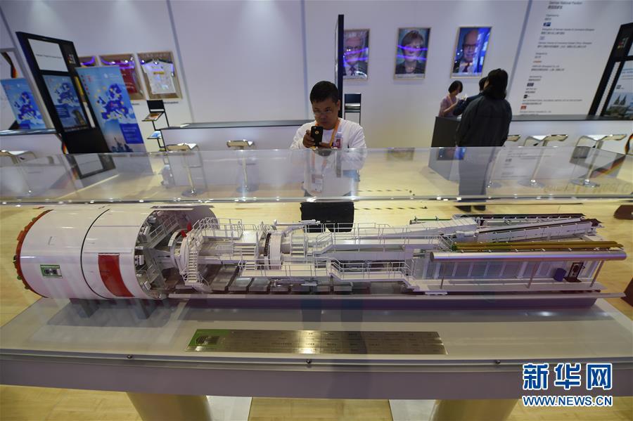 11月5日,一名參觀者在德國展館內(nèi)拍攝雙護盾盾構(gòu)機模型。 新華社記者 韓瑜慶 攝