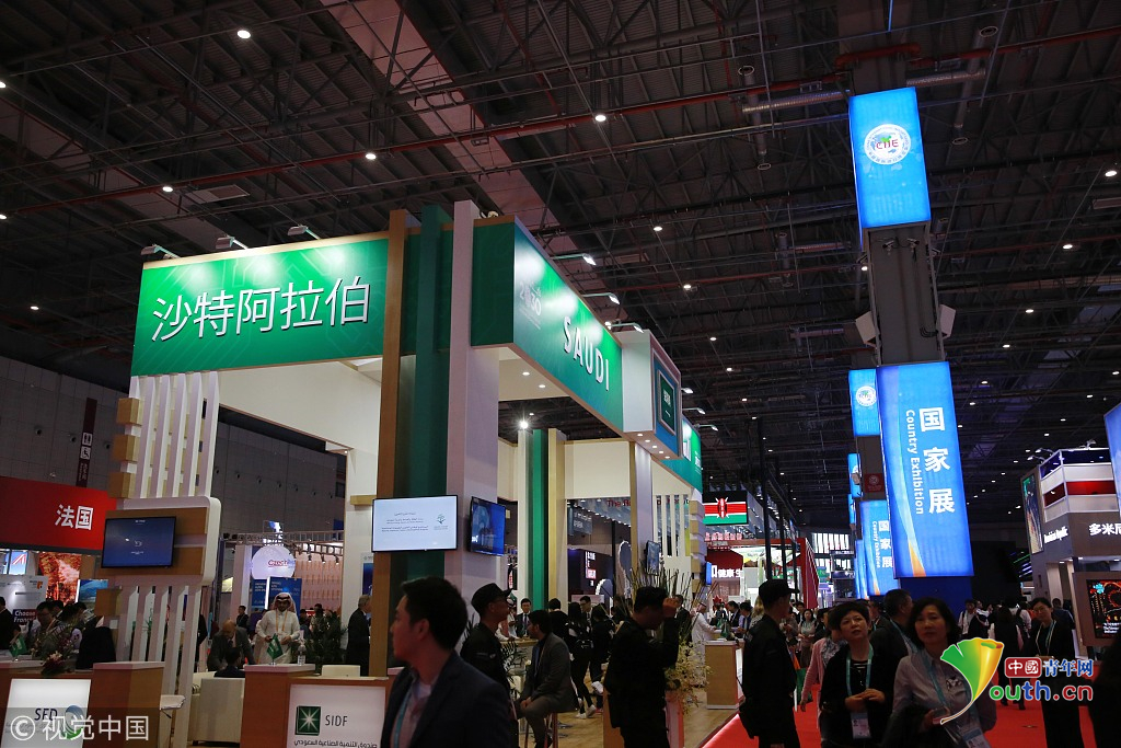 2018年11月6日,上海,首屆中國(guó)國(guó)際進(jìn)口博覽會(huì)國(guó)家展上,共有82個(gè)國(guó)家、3個(gè)國(guó)際組織設(shè)立了71個(gè)展臺(tái)。沙特阿拉伯館。視覺(jué)中國(guó)