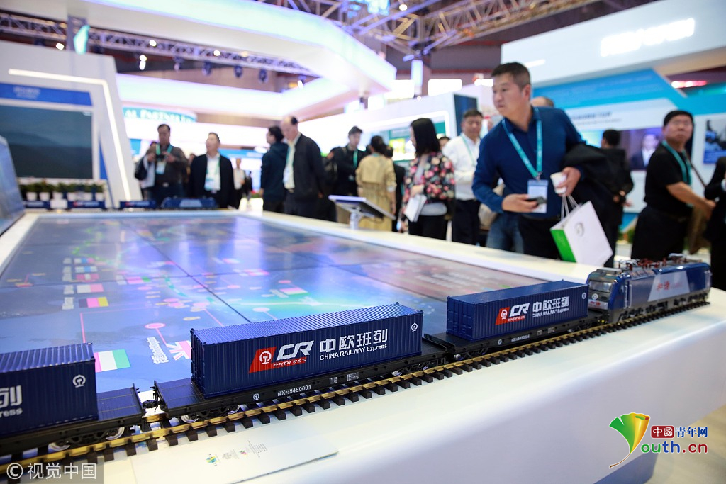 2018年11月6日,上海,首屆中國國際進(jìn)口博覽會(huì)國家展上,共有82個(gè)國家、3個(gè)國際組織設(shè)立了71個(gè)展臺(tái)。中國館展示的中歐班列。視覺中國