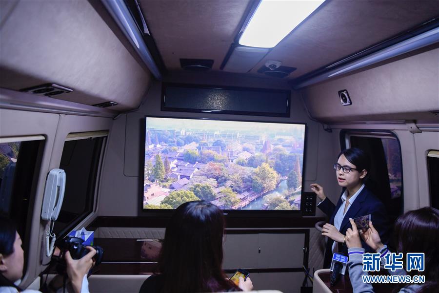在浙江移動烏鎮(zhèn)分水墩營業(yè)廳外,工作人員在一輛體驗巴士內(nèi)介紹通過5G移動傳輸技術(shù)實現(xiàn)的8K高清的視頻畫面實時展示(10月30日攝)。  新華社記者黃宗治攝