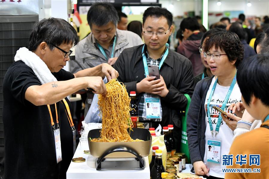 11月7日,來自新加坡廣祥泰私人有限公司的工作人員用公司生產(chǎn)的調(diào)料為觀眾現(xiàn)場烹制炒面。 新華社記者 李鑫 攝