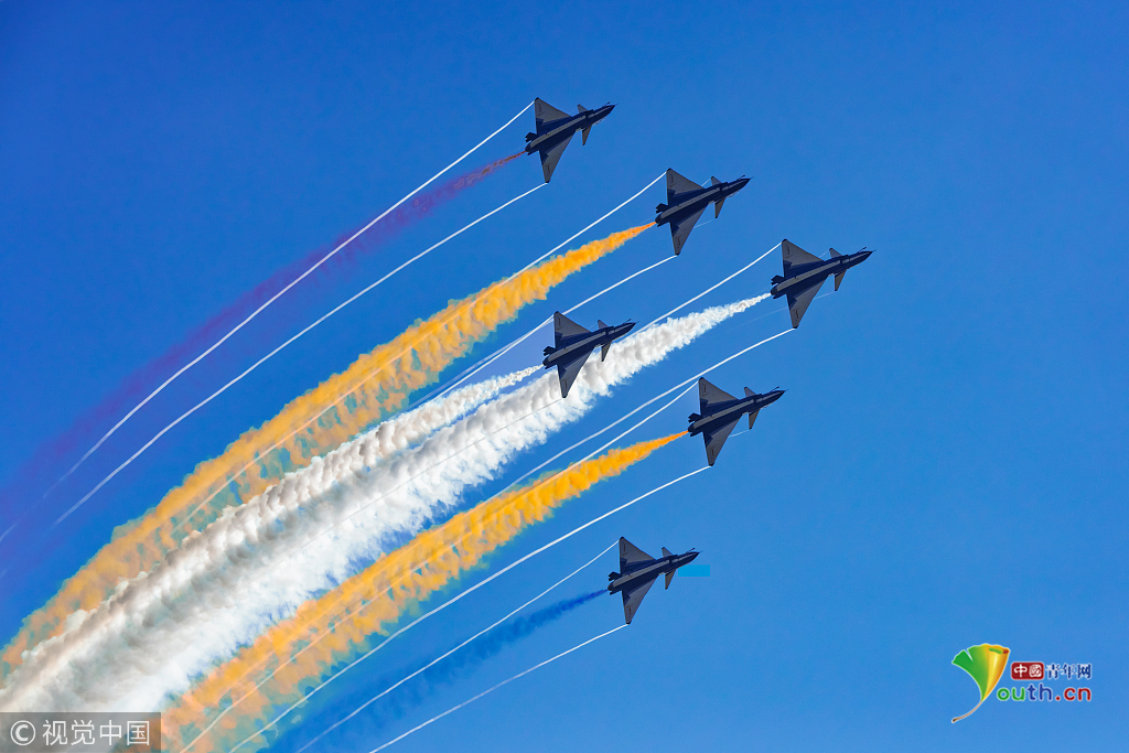 2018年11月6日,第十二屆中國國際航空航天博覽會(huì)在珠海拉開帷幕。八一飛行表演隊(duì)的殲-10率先上陣,為觀眾獻(xiàn)上精彩的飛行表演。視覺中國