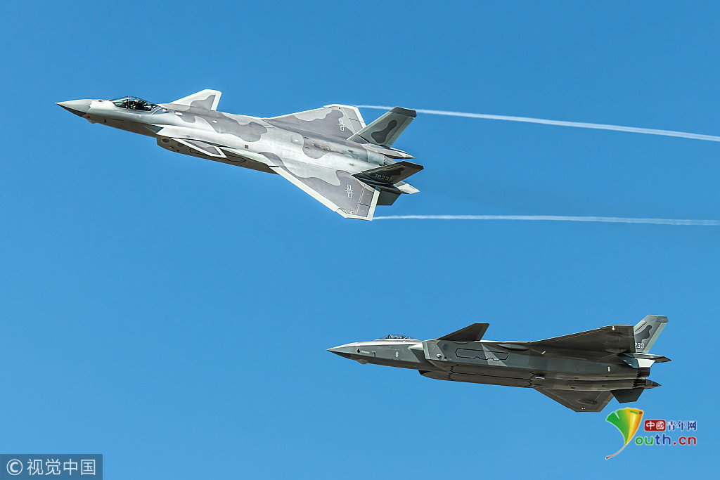 圖五:2018年11月6日,廣東珠海航展上,兩架殲-20戰(zhàn)機組成雙機編隊進(jìn)行飛行表演。