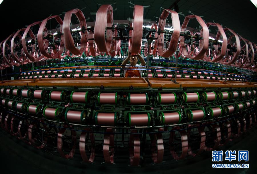 蘇州市吳江區(qū)盛澤鎮(zhèn)一家絲綢公司的工人在車間進(jìn)行絡(luò)絲作業(yè)(2017年5月20日攝)。 新華社記者 李響 攝