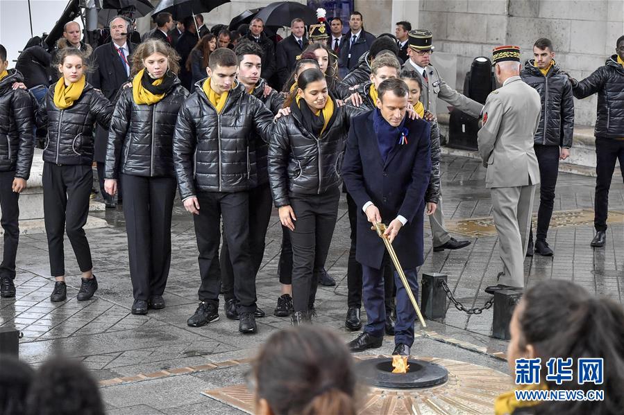 11月11日,在法國(guó)巴黎,法國(guó)總統(tǒng)馬克龍?jiān)诩o(jì)念儀式上撥旺無名烈士墓的火焰。當(dāng)日,法國(guó)政府在巴黎凱旋門前舉行儀式,隆重紀(jì)念第一次世界大戰(zhàn)結(jié)束一百周年。新華社記者 陳益宸 攝