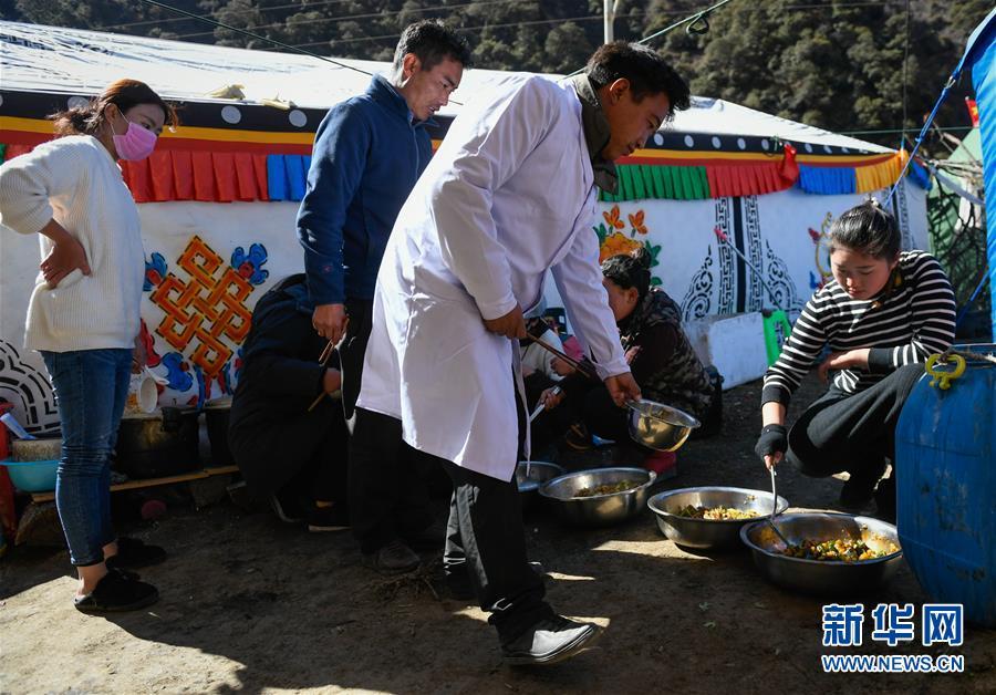 11月12日,在西藏昌都市江達縣波羅鄉(xiāng)康扎西安置點,工作人員在臨時廚房打飯。 西藏自治區(qū)江達縣波羅鄉(xiāng)康扎西安置點,離波羅鄉(xiāng)政府直線距離約3公里,位于一處地勢開闊平緩的山谷中,比堰塞湖水面高出100多米。10月11日金沙江白格段山體滑坡發(fā)生后,當地就在這里設立了安置點,安置附近受災群眾。 新華社記者 劉東君 攝