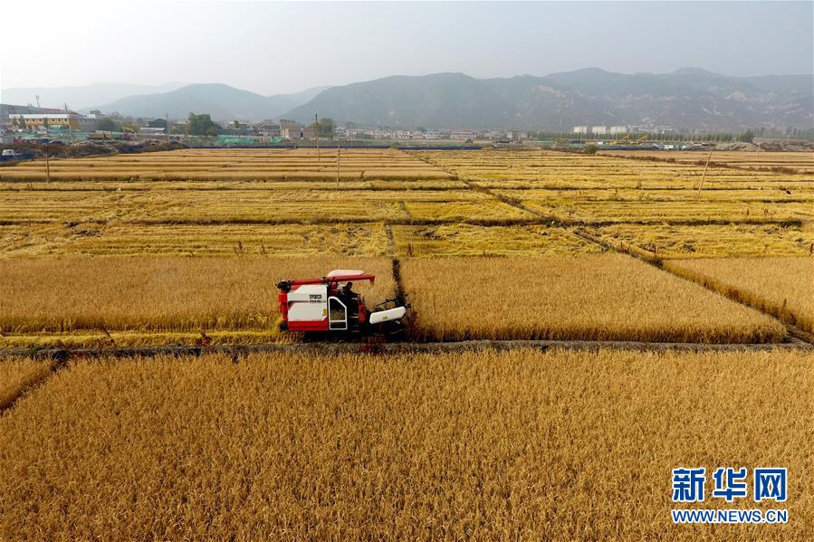 在太原市晉源區(qū)赤橋村,收割機(jī)在稻田里作業(yè)(10月17日無人機(jī)拍攝)。近日,山西省太原市晉源區(qū)2000多畝水稻迎來收割季。 金秋時(shí)節(jié),農(nóng)民們忙著收獲成熟的農(nóng)作物,喜迎豐收。 新華社記者 詹彥 攝