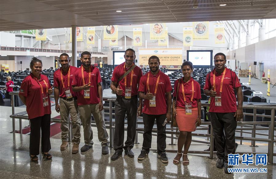 11月13日,幾名工作人員在巴布亞新幾內亞首都莫爾茲比港的APEC國際媒體中心內合影。 新華社記者白雪飛攝