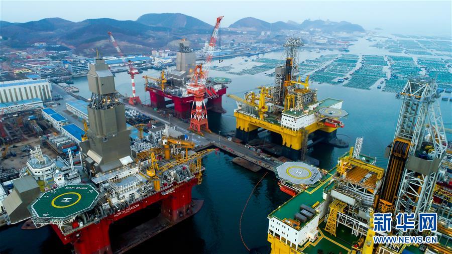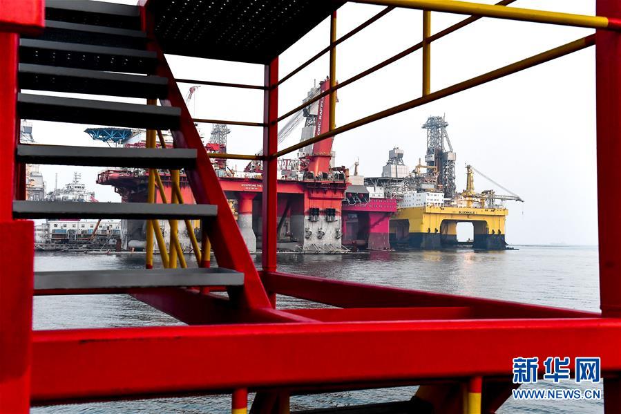 中集來(lái)福士海洋工程有限公司煙臺(tái)基地深水碼頭停放的半潛式鉆井平臺(tái)(11月14日無(wú)人機(jī)航拍)。新華社發(fā)(張丞攝)