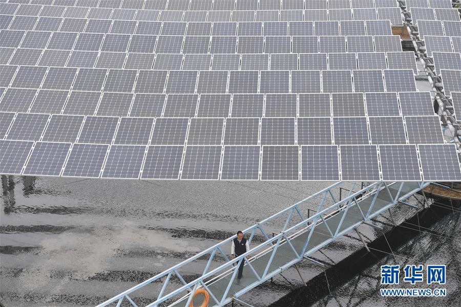 11月20日,在福建省石獅市中心區(qū)城市污水處理廠,工作人員從一片光伏發(fā)電板附近經(jīng)過。