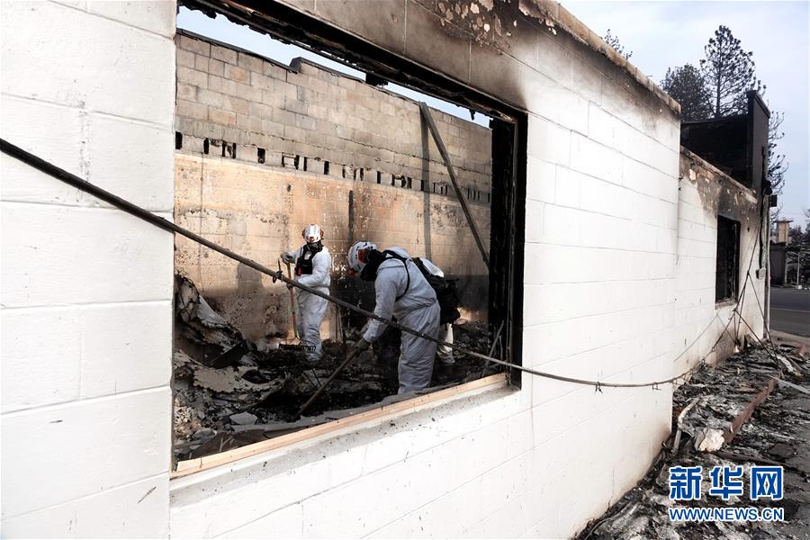 11月20日,在美國加利福尼亞州比尤特縣天堂鎮(zhèn),救援人員在山火廢墟中工作。