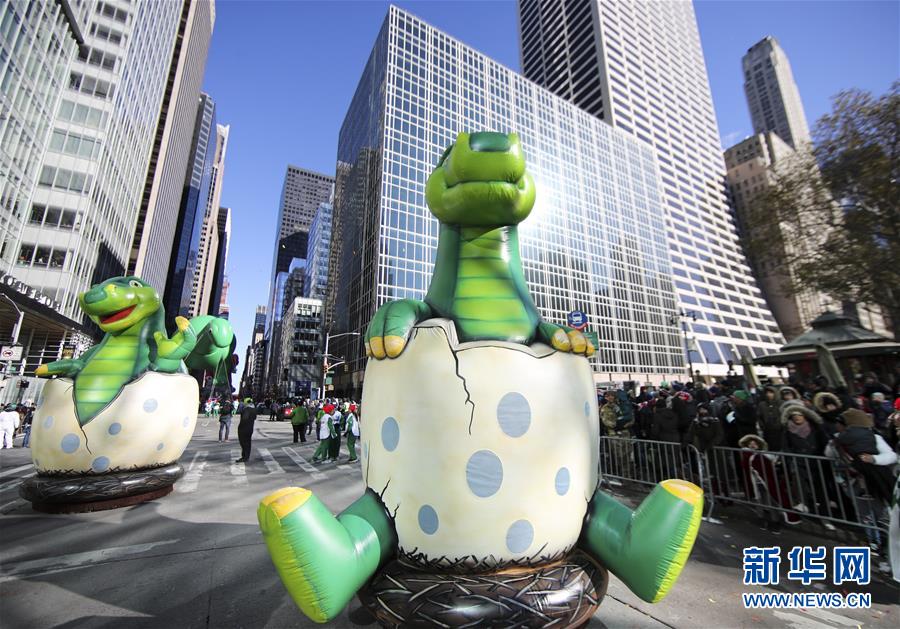 11月22日,在美國紐約感恩節(jié)大游行上,“恐龍寶寶”造型氣球車行進在曼哈頓街頭。