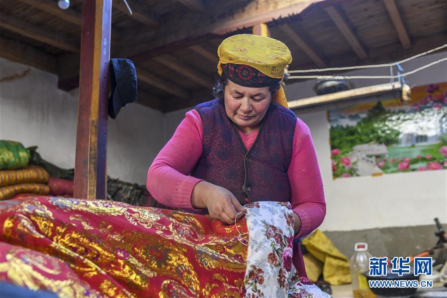 在塔什庫爾干塔吉克自治縣大同鄉(xiāng)阿克托尕欄桿村一組都熱的舊居中,都熱·加爾曼的妻子在縫制新被子,為搬遷新居做準(zhǔn)備(11月13日攝)。新華社記者胡虎虎攝