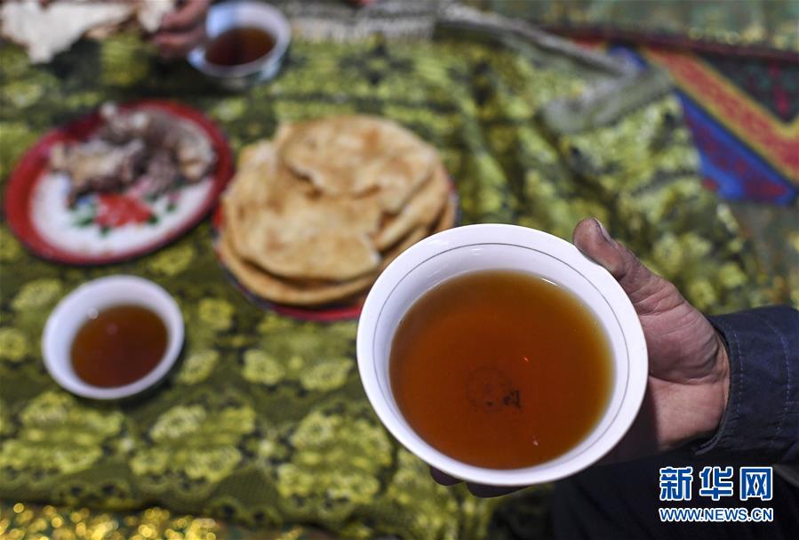 在塔什庫爾干塔吉克自治縣大同鄉(xiāng)阿克托尕欄桿村一組都熱的舊居中,都熱·加爾曼在吃早餐,準(zhǔn)備踏上搬遷之路(11月17日攝)。新華社記者胡虎虎攝