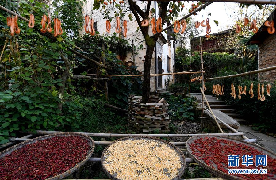 2017年10月26日拍攝的篁嶺古村一角。近日天氣晴朗,江西省婺源縣江灣鎮(zhèn)篁嶺村村民抓住時機(jī)采摘、晾曬皇菊及蔬果。明黃的菊花、火紅的辣椒……各種顏色將篁嶺古村裝扮成巨大的“調(diào)色板”,引來眾多游客感受鄉(xiāng)村美景。新華社記者宋振平 攝