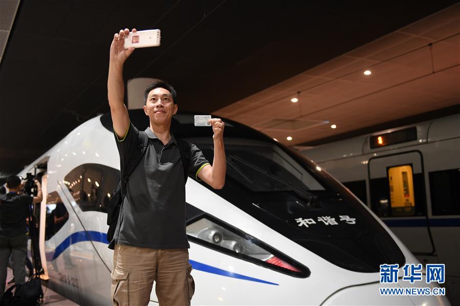 2018年9月23日,廣深港高鐵全線開通,搭乘G5711次高鐵列車前往香港西九龍站的乘客在深圳北站拍照留念。新華社記者毛思倩 攝
