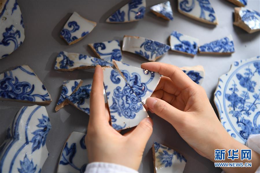在江西景德鎮(zhèn)御窯廠遺址,工作人員正在修復明代瓷枕(10月18日攝)。 新華社記者 萬象 攝