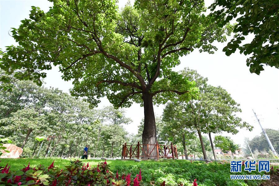 在河南蘭考縣焦裕祿干部學(xué)院門(mén)口,游客從“焦桐”下走過(guò)(2017年8月9日攝)。新華社記者馮大鵬攝